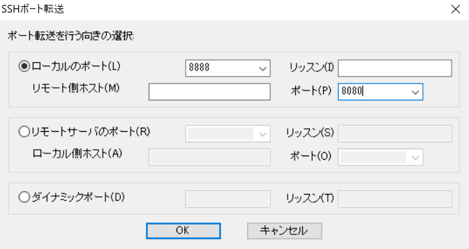 自分自身のPCでしかアクセスできないようです。ubuntu Desktopではないのでブラウザを使用することができません。この問題をSSH転送することで解決することにしました。TeraTermの場合、設定にあるSSH転送にポート番号を記入して接続をします。