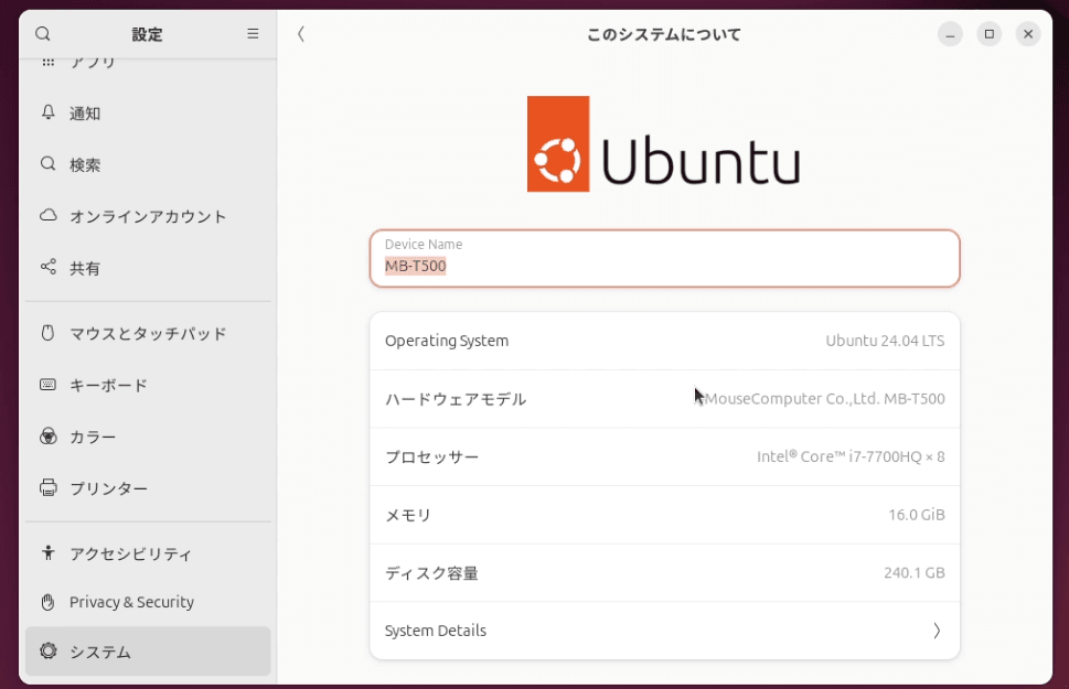 用意したPCのスペックを確認しておきます。ページによるとIntel VT-x / AMD SVMをサポートするCPUが必要とのことです。GUI操作にて確認するとプロセッサが以下のように表示されたので、VT-x技術をサポートしています。ですので、このCPUはVT-xの要件を満たしています。VT-xは、Intelの仮想化技術で、仮想マシンをより効率的に動作させるために必要です。