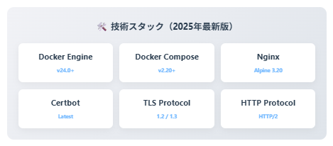 このガイドでは、2025年最新のベストプラクティスに基づいて、Docker + Nginx + Let’s Encryptを使用した自動SSL更新リバースプロキシの構築方法を詳しく説明しました。