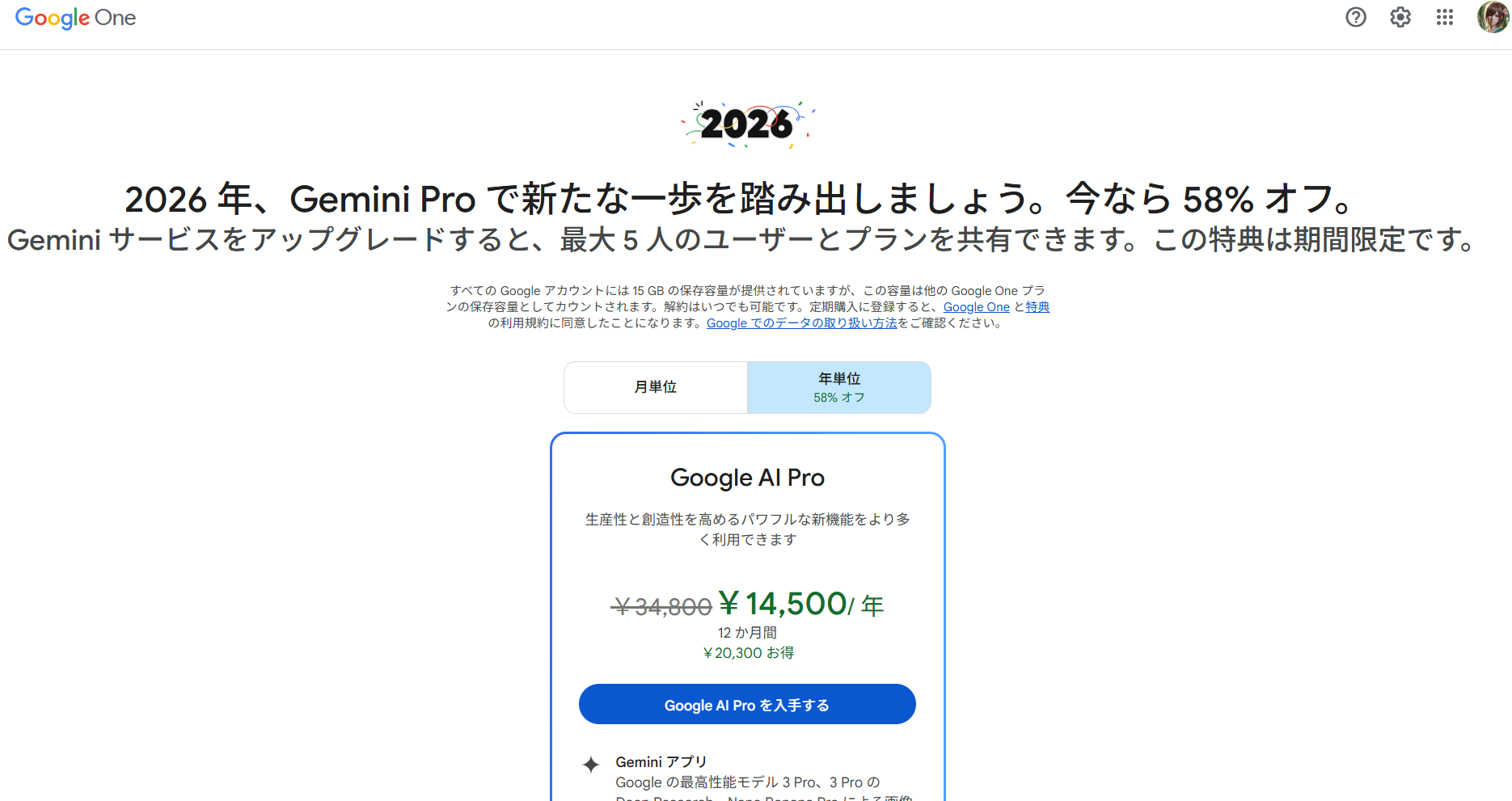 これまで「Gemini Advanced(Google One AI プレミアム)」として知られていたプランが、どうやら「Google AI Pro」という名称で、2026年に向けた先行キャンペーンを行っているようです。
